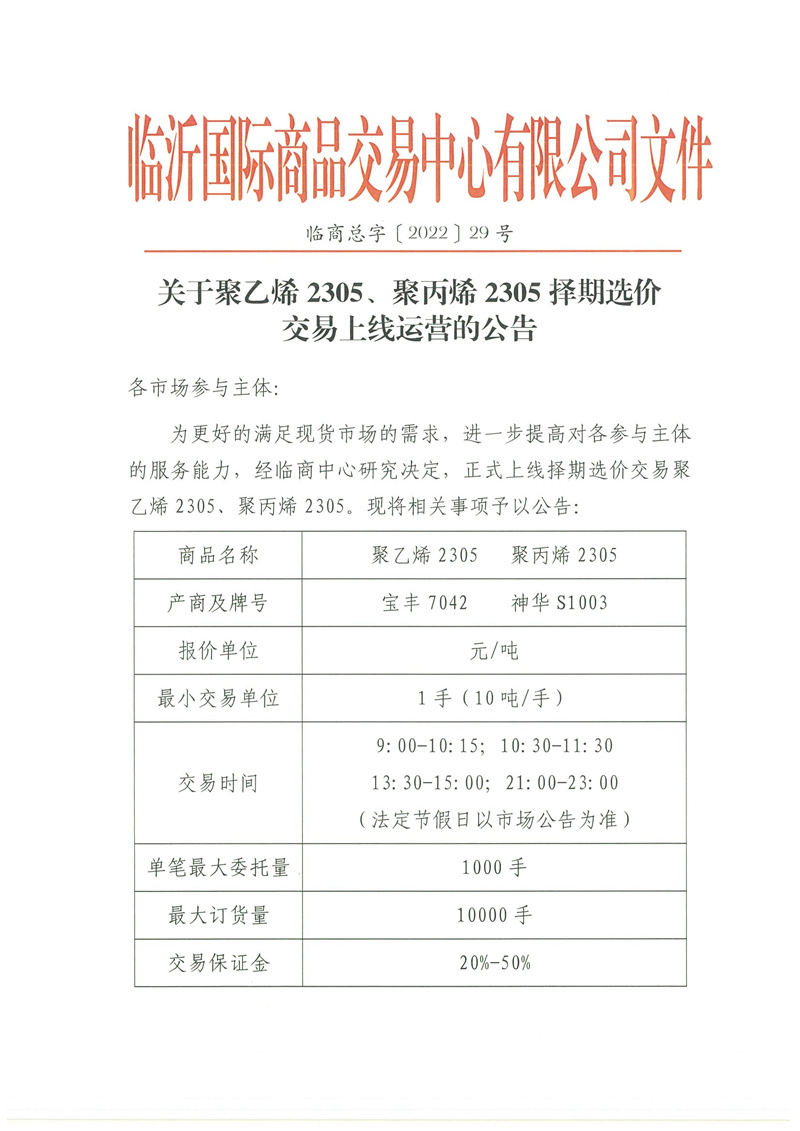 關(guān)于聚乙烯2305、聚丙烯2305擇期選價(jià)交易上線運(yùn)營(yíng)的公告