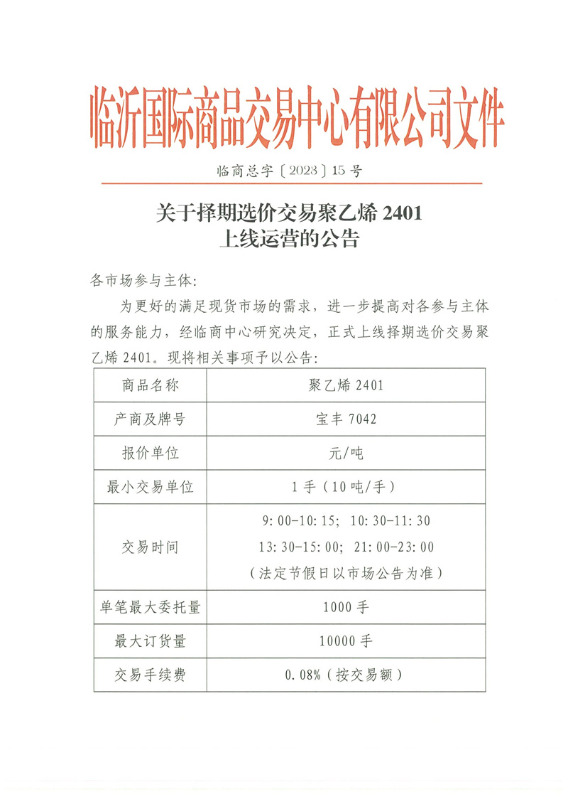 關于擇期選價交易聚乙烯 2401上線運營的公告