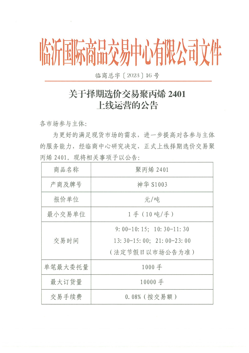 關(guān)于擇期選價(jià)交易聚丙烯 2401上線運(yùn)營的公告