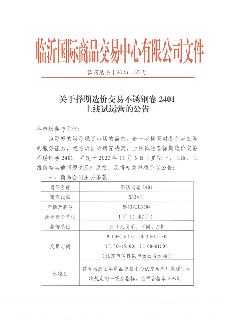 附件:臨沂國際商品交易中心有限公司擇期選價交易不銹鋼卷2312合同上線試運營說明書.doc