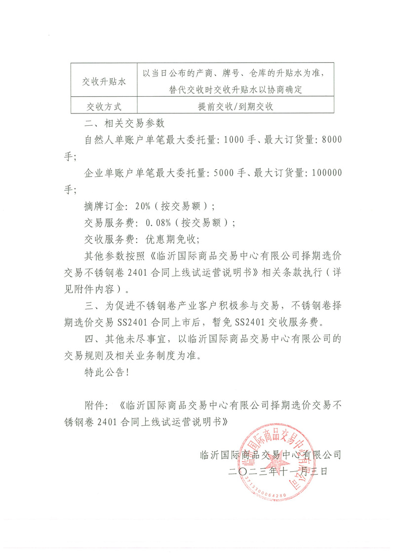 臨沂國際商品交易中心有限公司擇期選價交易不銹鋼卷2401合同上線試運(yùn)營說明書.doc