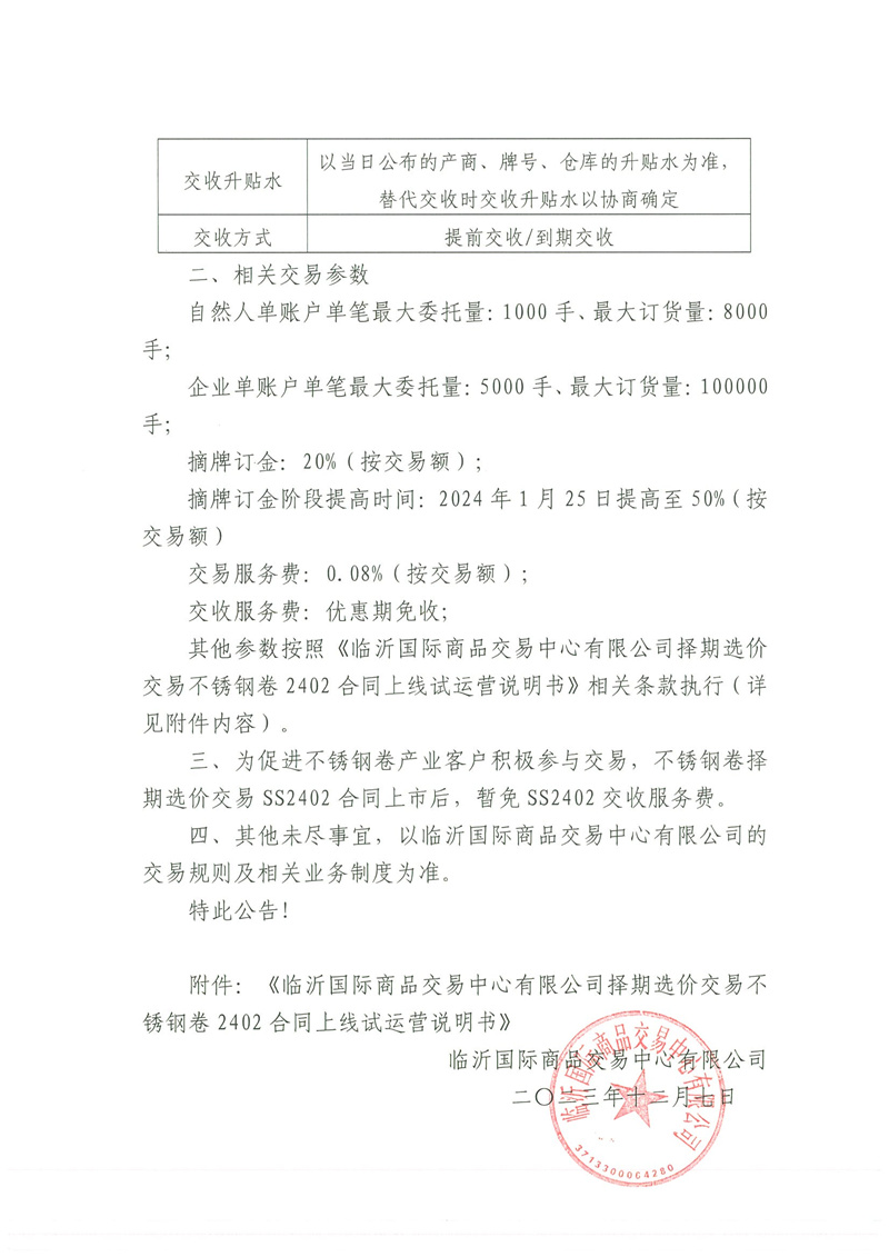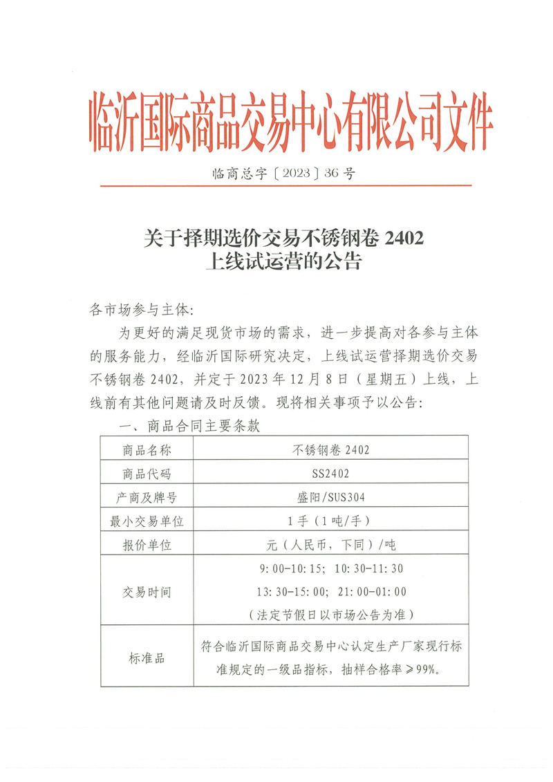 關(guān)于擇期選價(jià)交易不銹鋼卷2402上線試運(yùn)營的公告