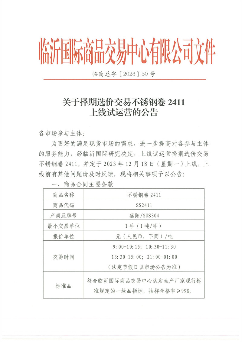 臨沂國際商品交易中心有限公司擇期選價交易不銹鋼卷2411合同上線試運營說明書.doc