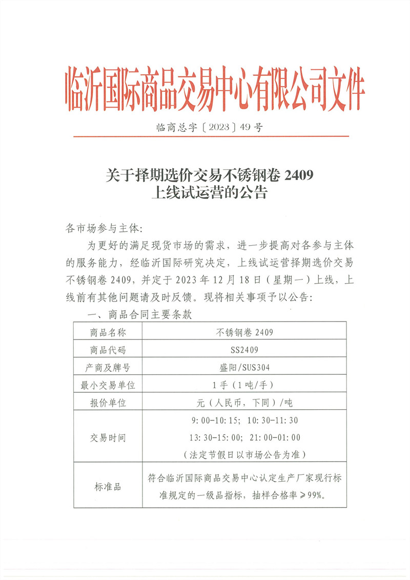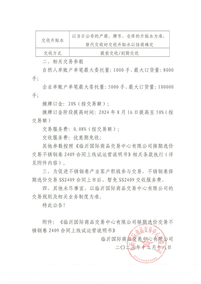關(guān)于擇期選價(jià)交易不銹鋼卷 2409上線試運(yùn)營的公告