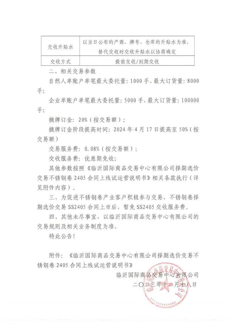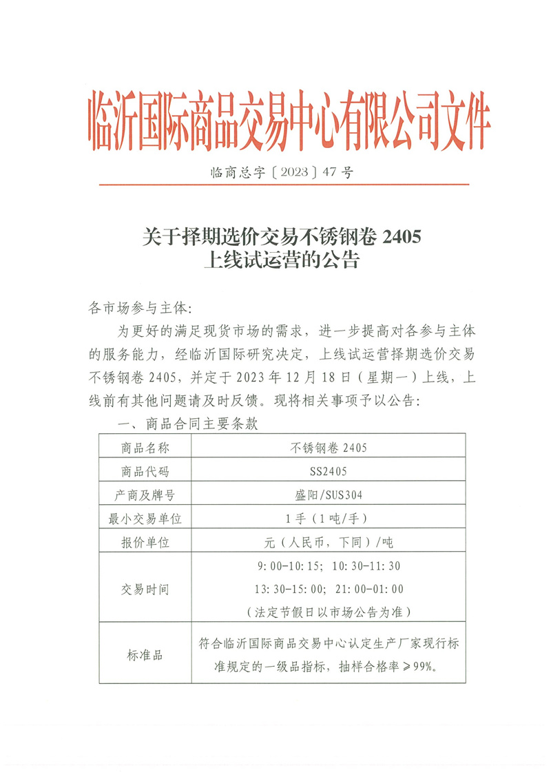 關(guān)于擇期選價(jià)交易不銹鋼卷 2405上線試運(yùn)營的公告