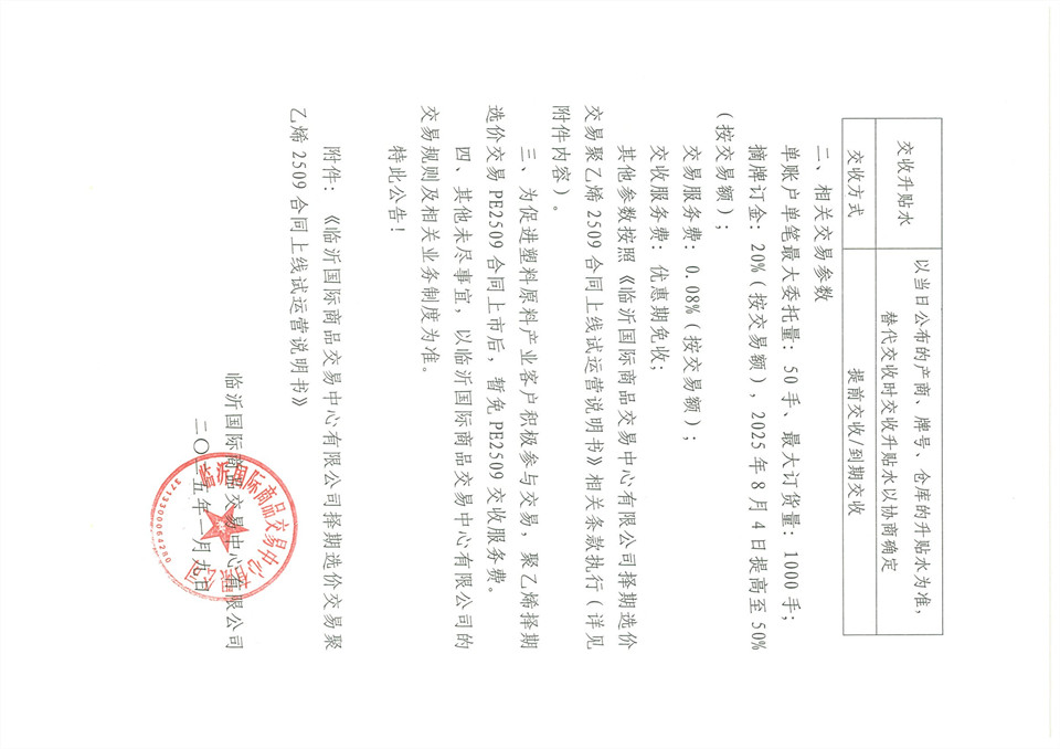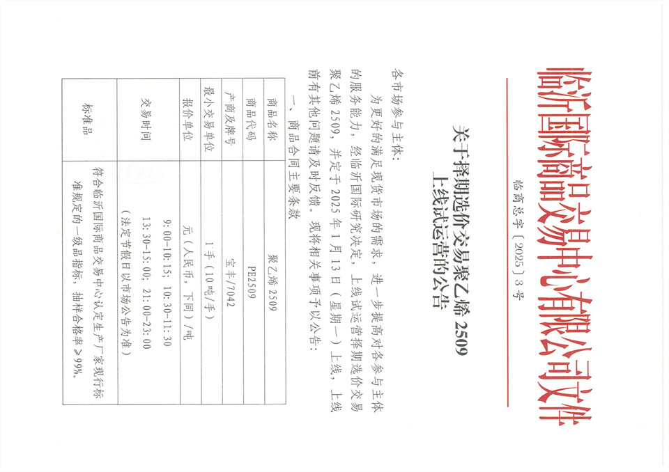 關(guān)于擇期選價交易聚乙烯2509上線試運(yùn)營的公告