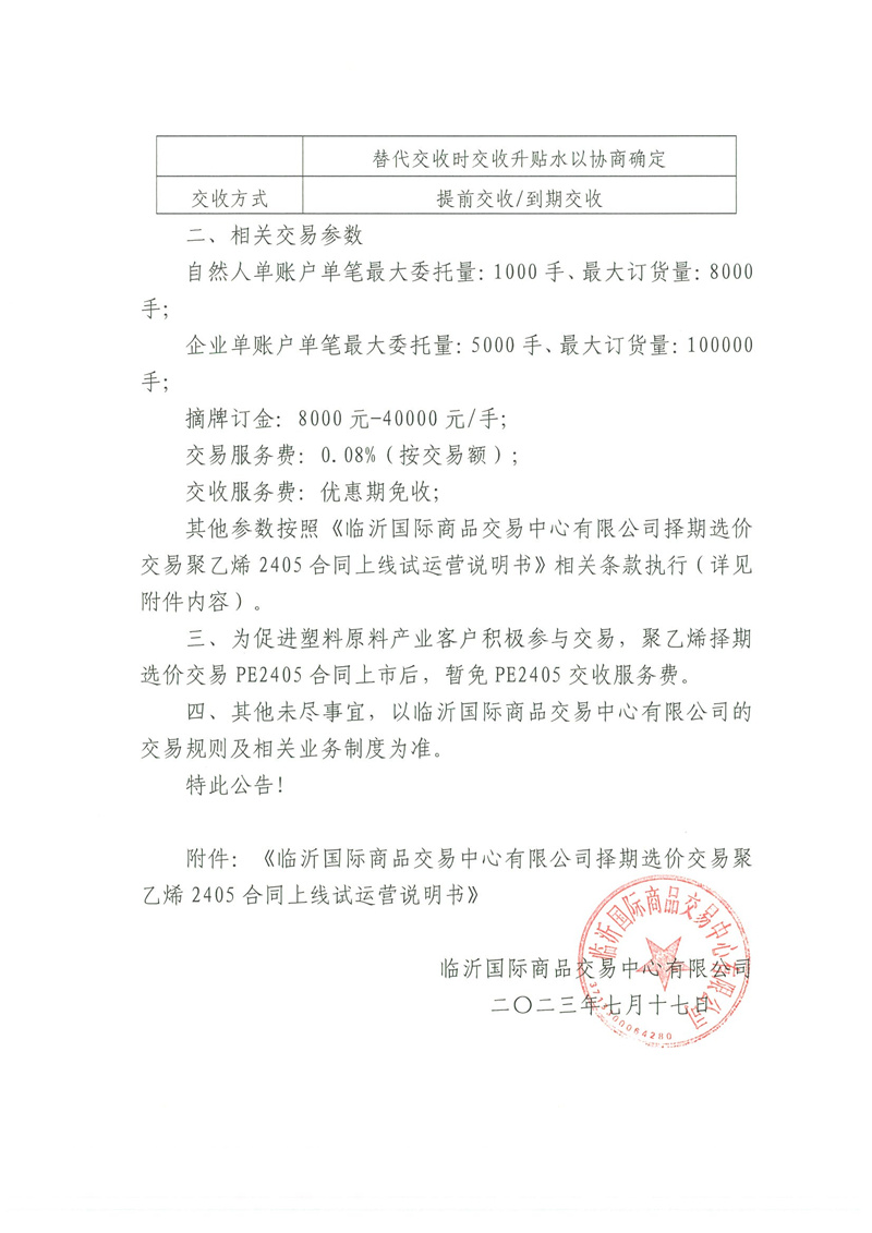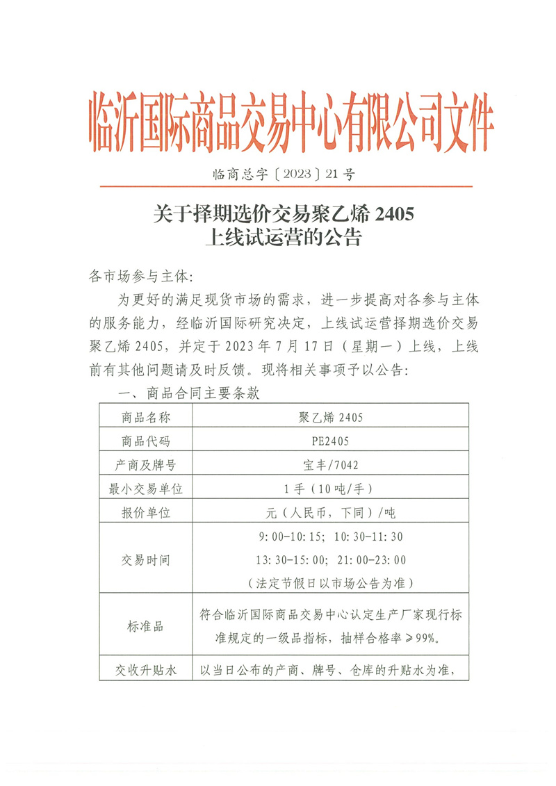 關(guān)于擇期選價(jià)交易聚乙烯2405上線試運(yùn)營的公告