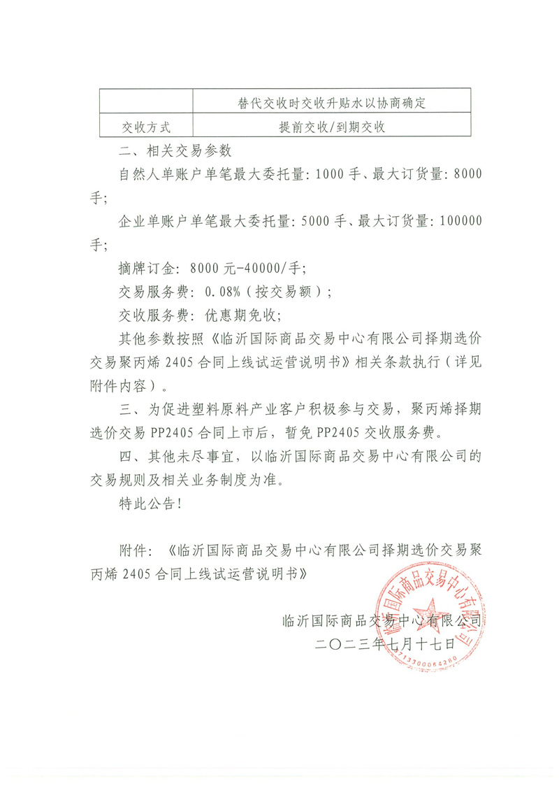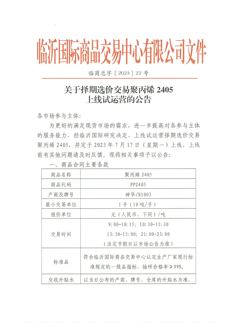 關(guān)于擇期選價(jià)交易聚丙烯2405上線試運(yùn)營(yíng)的公告