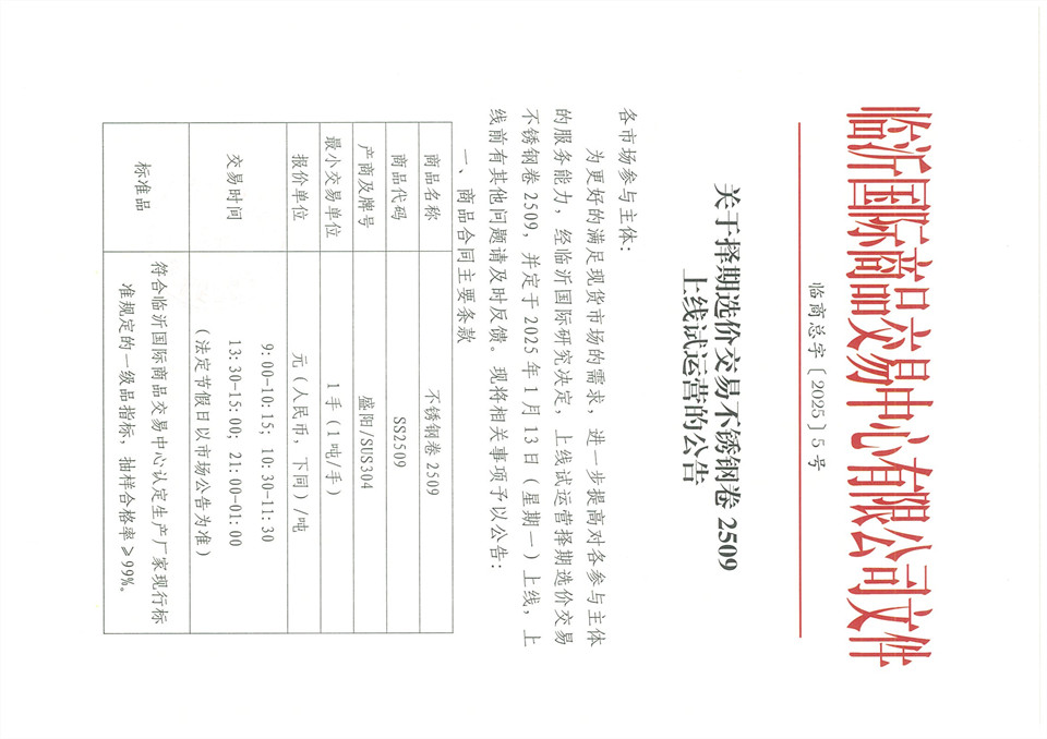 關(guān)于擇期選價(jià)交易不銹鋼卷2509上線試運(yùn)營(yíng)的公告