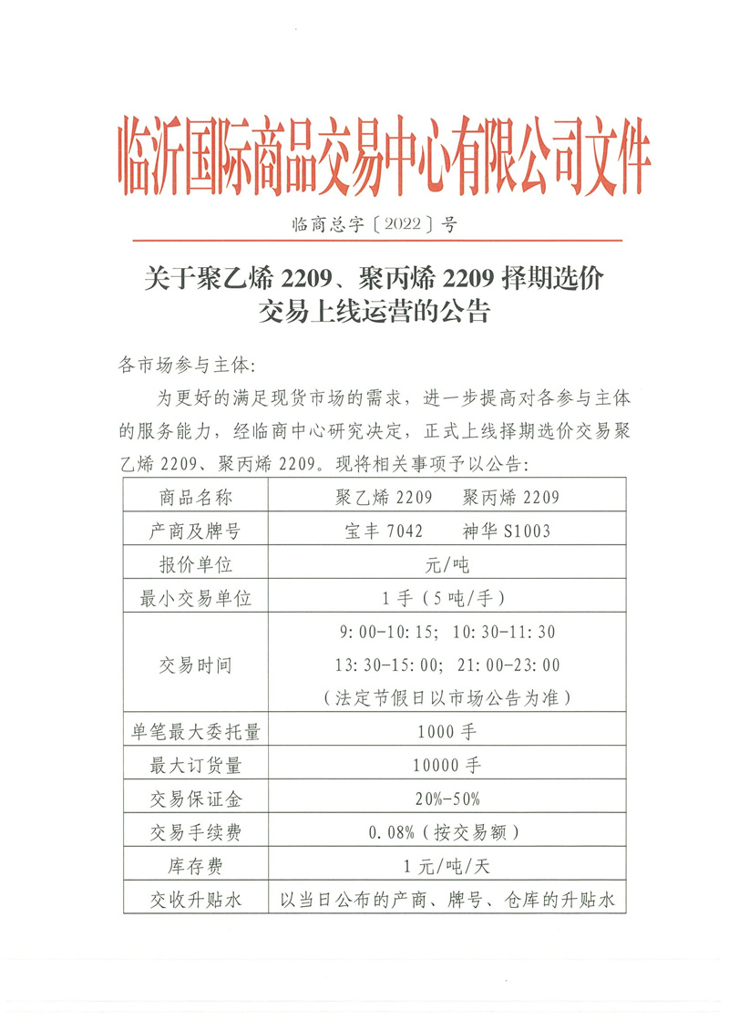 關(guān)于聚乙烯2209、聚丙烯2209擇期選價(jià)交易上線運(yùn)營的公告